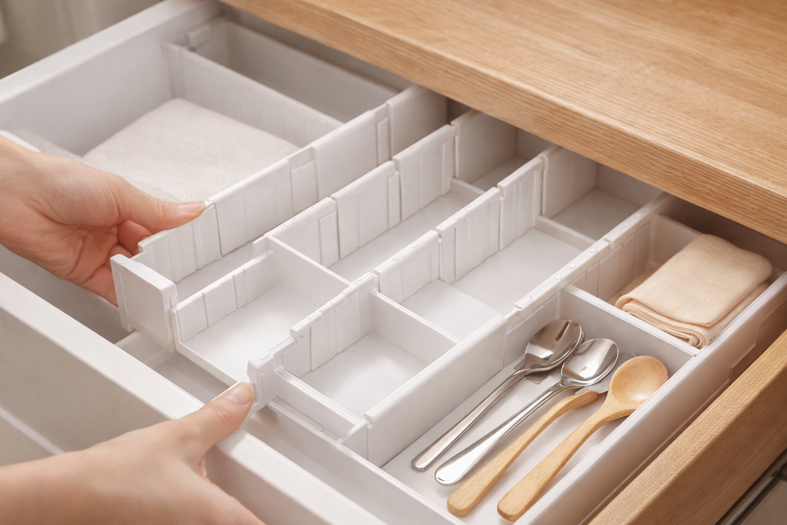 An expandable, adjustable design that adapts seamlessly to your drawer — no gaps, no wasted space, no measuring stress.